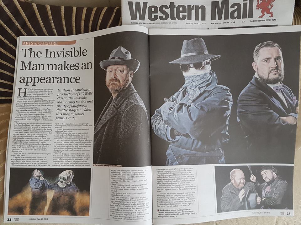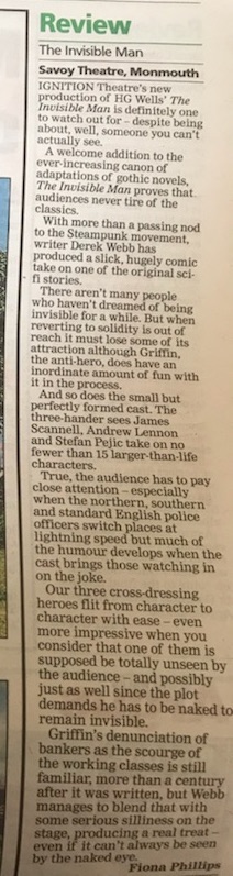 "We came to see The Invisible Man in Monmouth and just wanted to say what a cracking job you did of it, I can't remember laughing so much during a play. James Scannell, Andrew Lennon and Stefan Pejic were fantastic with great comic timing and skilled portrayal of multiple characters, which broke the forth wall in all the right ways with the talented team and effective set. Sincerely one of the funniest plays I've ever seen Thank you.”